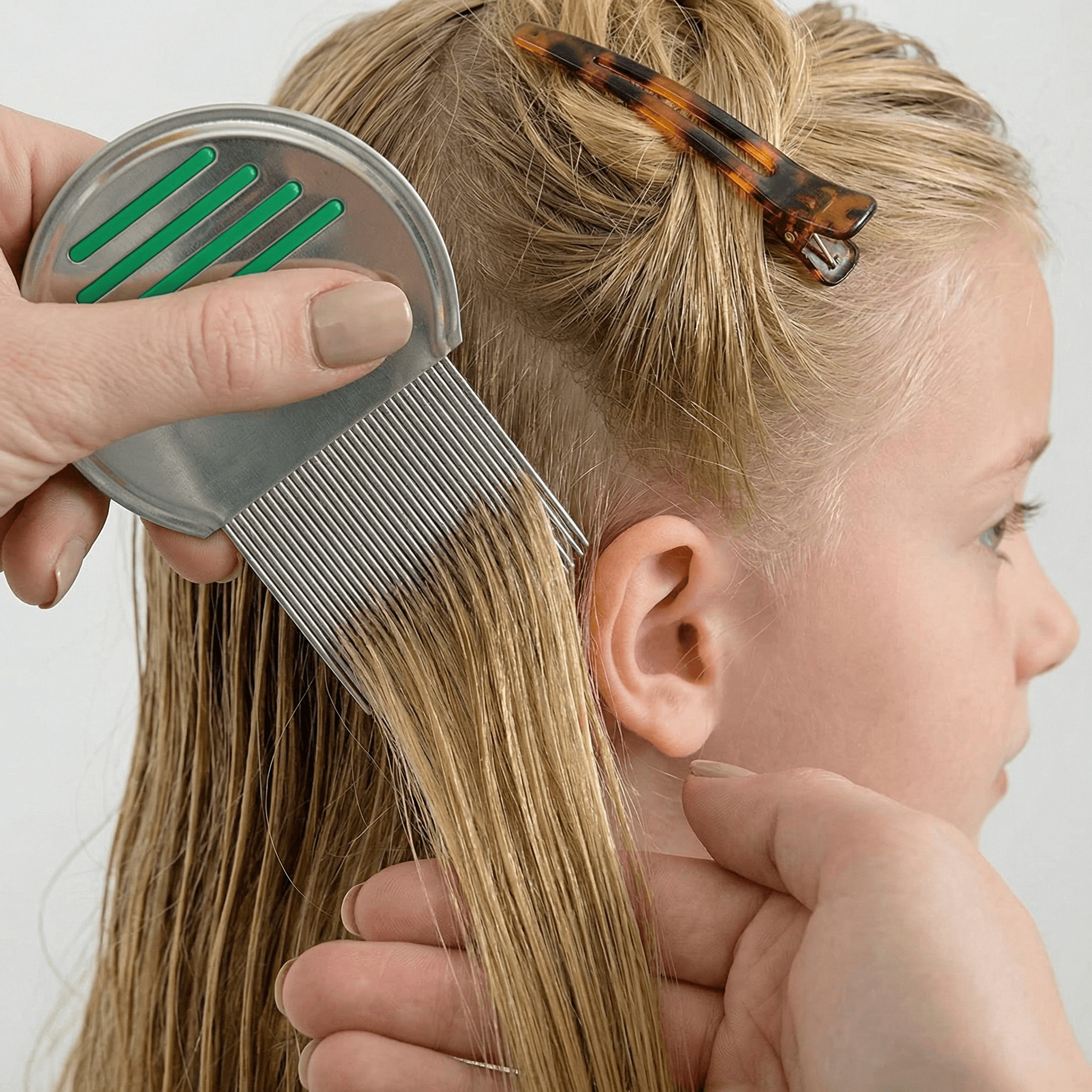 Precision treatment: We apply targeted heat, then section and comb every strand to remove bugs and nits.