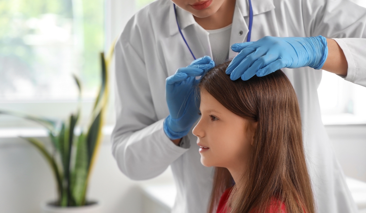 A trained professional is carefully treating a child’s hair for lice at a Seattle lice treatment center. The technician uses a fine-toothed comb to inspect the hair thoroughly.